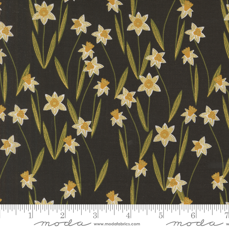 Bee Garden Metallic Darling Daffodils Black | Gingiber | Moda Fabrics | 48413 21M | Sold in 1/2 Yd